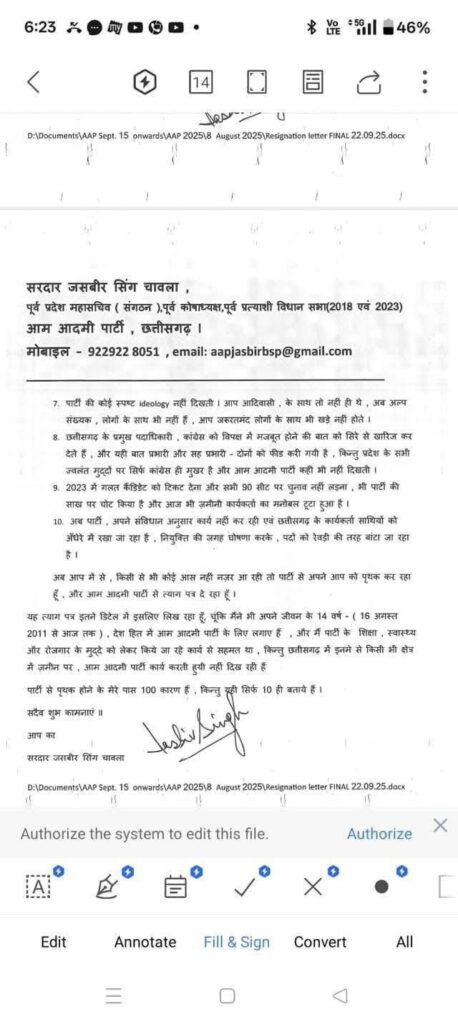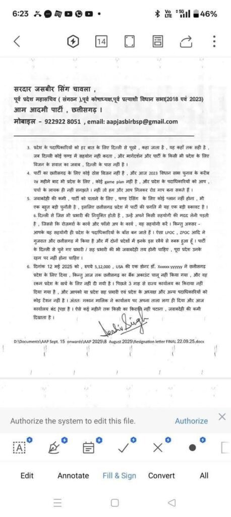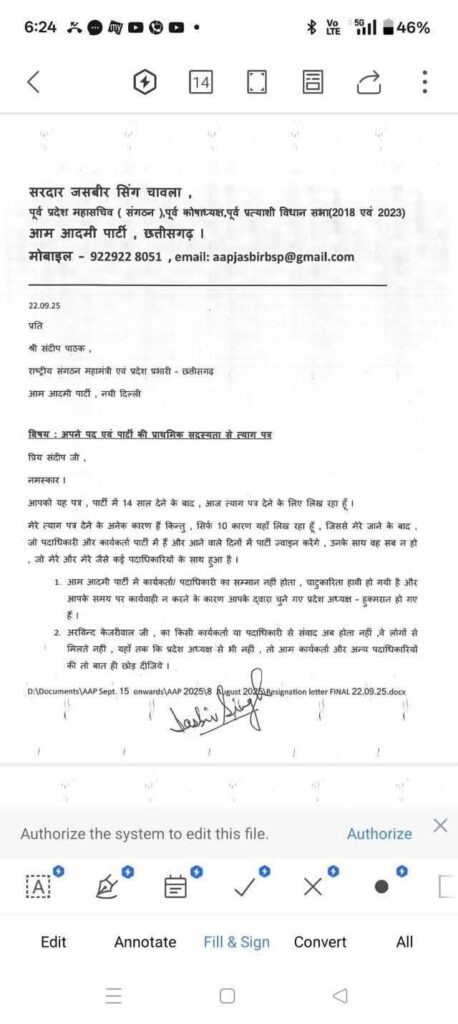 आम आदमी पार्टी (AAP) को छत्तीसगढ़ में बड़ा झटका लगा है। पार्टी के वरिष्ठ नेता, पूर्व प्रदेश महासचिव (संगठन), पूर्व कोषाध्यक्ष और 2018 एवं 2023 विधानसभा चुनावों में प्रत्याशी रहे सरदार जसबीर सिंह चावला ने पार्टी से इस्तीफ़ा दे दिया है। उन्होंने न केवल अपने सभी पदों से बल्कि पार्टी की प्राथमिक सदस्यता से भी त्यागपत्र दिया है।