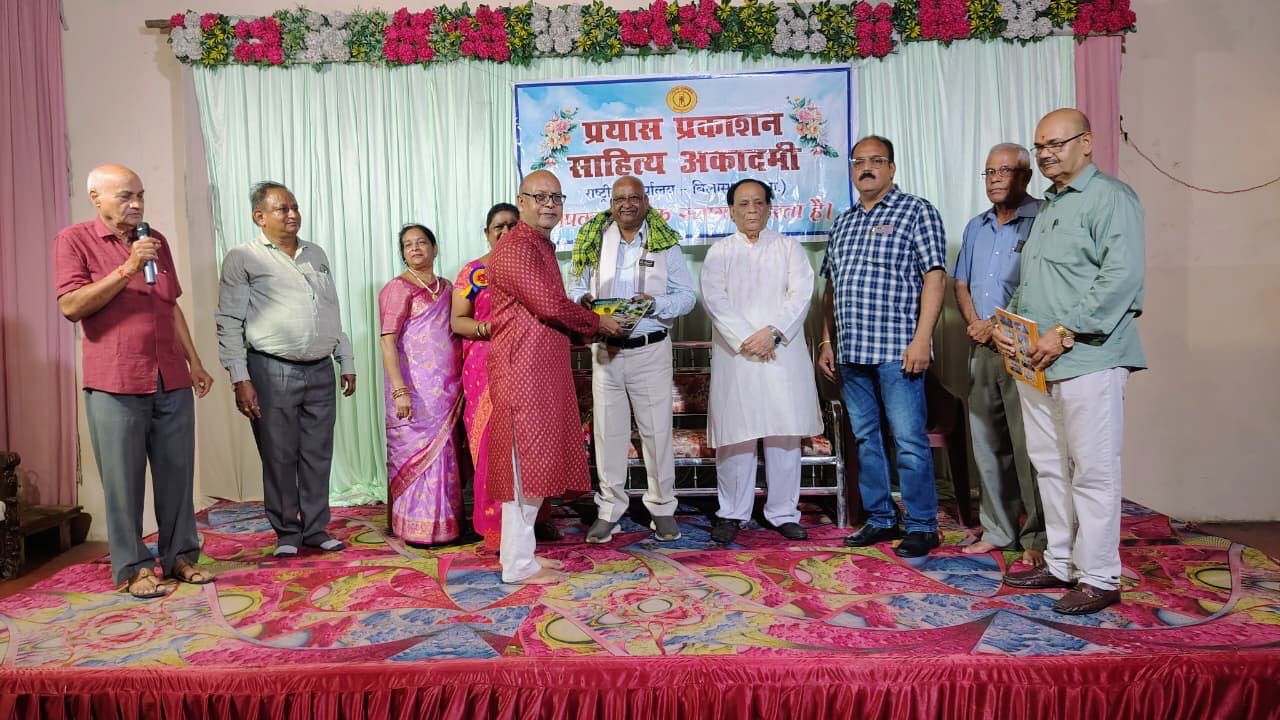 चांपा / प्रयास प्रकाशन साहित्य अकादमी और पंडित अमृतलाल दुबे जयंती समारोह के संयुक्त आयोजन और भाषाविद पूर्व अध्यक्ष छत्तीसगढ़ राजभाषा आयोग और कुलपति थावे विद्यापीठ गोपालगंज बिहार डॉ विनय कुमार पाठक के मुख्य आतिथ्य तथा श्री सनत तिवारी वरिष्ठ साहित्यकार के विशिष्ट अस्थिरता में प्रो अश्विनी केशरवानी को उनकी पाँच दशक की साहित्यिक साधना के लिए शाल , श्रीफल और स्मृति चिह्न देकर सम्मानित किया गया ।