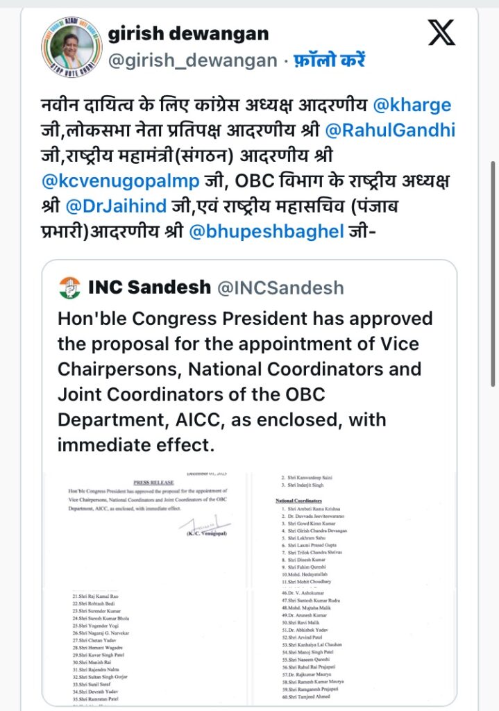 कांग्रेस नेता गिरीश देवांगन ने सोशल मीडिया एक्स पर पोस्ट करके लिखा कि नवीन दायित्व के लिए कांग्रेस अध्यक्ष मल्लिकार्जुन खरगे, लोकसभा नेता प्रतिपक्ष राहुल गांधी, राष्ट्रीय महामंत्री(संगठन) केसी वेणुगोपाल, OBC विभाग के राष्ट्रीय अध्यक्ष डॉ. अनिल जयहिंद एवं राष्ट्रीय महासचिव (पंजाब प्रभारी) भूपेश बघेल का हृदय से धन्यवाद एवं आभार व्यक्त करता हूँ और यह विश्वास दिलाते हैं कि संगठन मजबूती के साथ ही साथ देश में पिछड़ा वर्ग के अधिकारों की आवाज़ बुलंद करने का सम्पूर्ण समर्पण से प्रयास करेंगे.