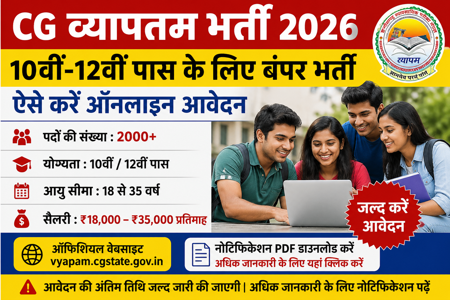 छत्तीसगढ़ में सरकारी नौकरी की तैयारी कर रहे युवाओं के लिए बड़ी खुशखबरी है। छत्तीसगढ़ व्यावसायिक परीक्षा मंडल (CG Vyapam) द्वारा विभिन्न पदों पर बंपर भर्ती की घोषणा की गई है।