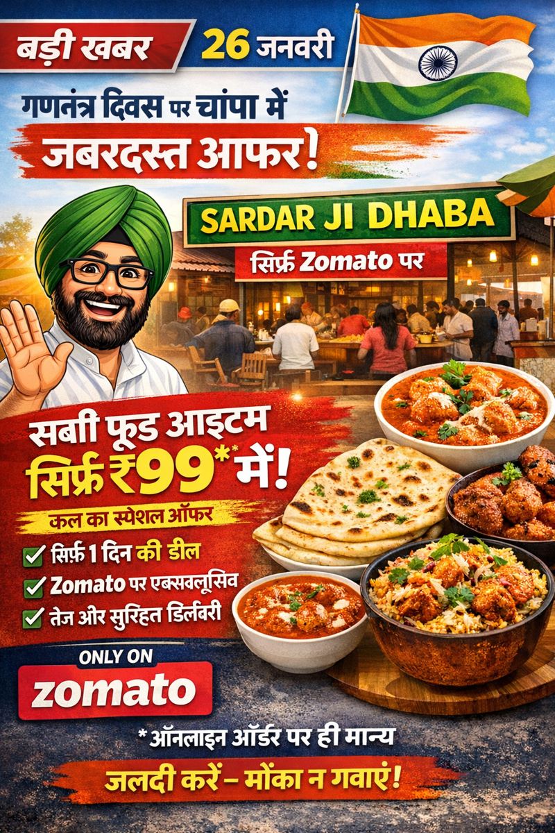 рджреЗрд╢рднрд░ рдореЗрдВ 26 рдЬрдирд╡рд░реА рдЧрдгрддрдВрддреНрд░ рджрд┐рд╡рд╕ рдХреЛ рд▓реЗрдХрд░ рдЙрддреНрд╕рд╛рд╣ рдХрд╛ рдорд╛рд╣реМрд▓ рд╣реИред рдЗрд╕реА рдмреАрдЪ рдЪрд╛рдВрдкрд╛ рд╢рд╣рд░ рдХреЗ рдкреНрд░рд╕рд┐рджреНрдз Sardar Ji Dhaba рдХреА рдУрд░ рд╕реЗ рдЧреНрд░рд╛рд╣рдХреЛрдВ рдХреЗ рд▓рд┐рдП рдПрдХ рдЦрд╛рд╕ рдФрд░ рдХрд┐рдлрд╛рдпрддреА рдСрдлрд░ рдХреА рдШреЛрд╖рдгрд╛ рдХреА рдЧрдИ рд╣реИред